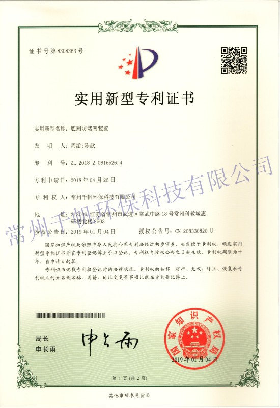 發明專利證書 一種自動上浮微孔曝氣裝置